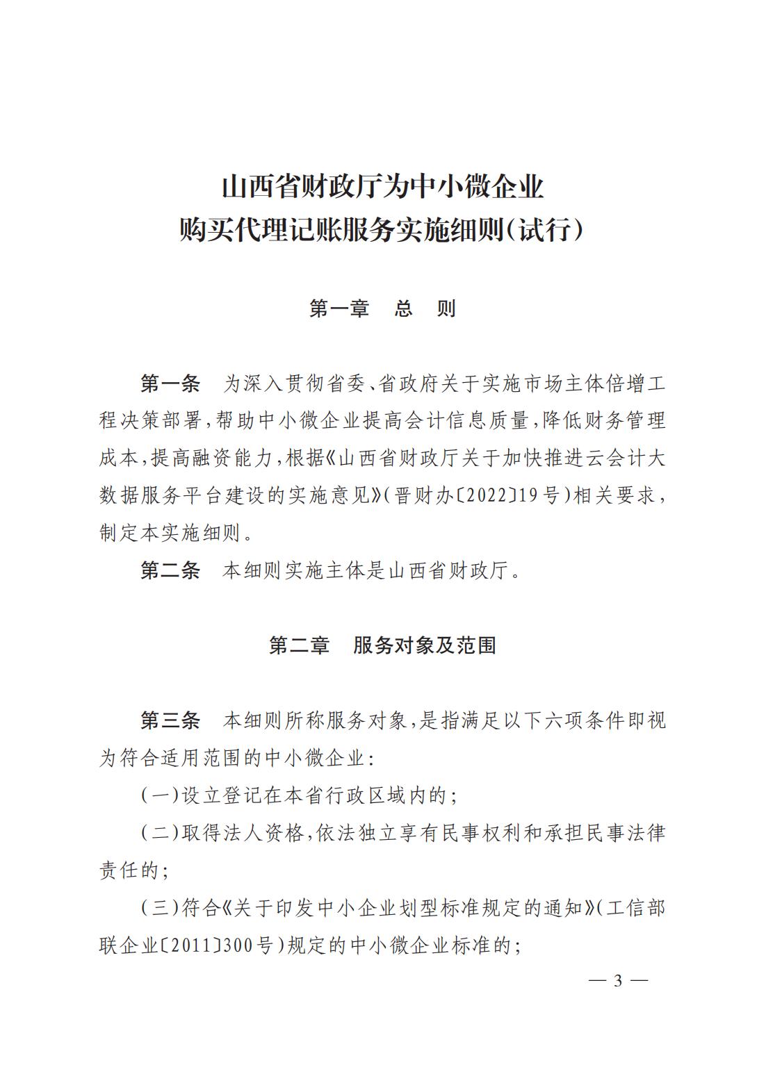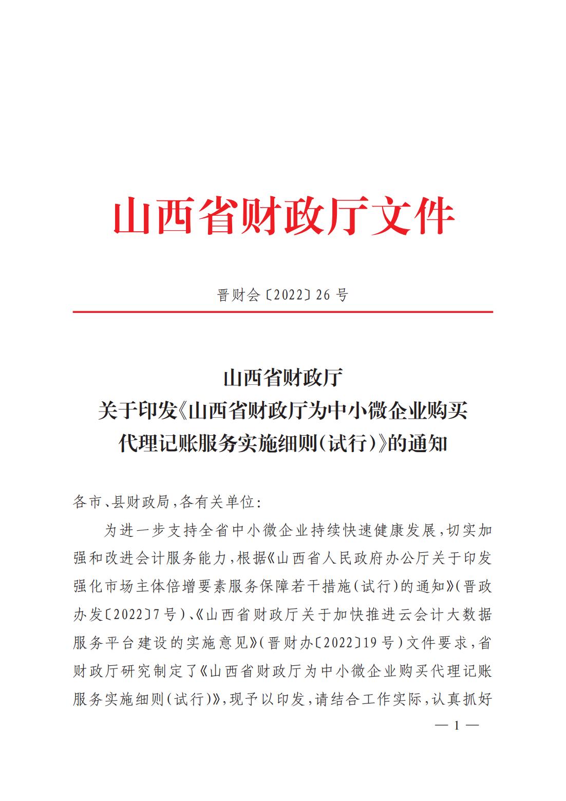關于印發(fā)《山西省財政廳為中小微企業(yè)購買代理記賬服務實施細則(試行)》的通知